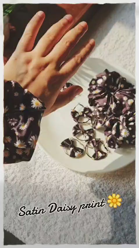 Daisy print hair scrunchies with matching bow earrings set Black satin with white floral pattern